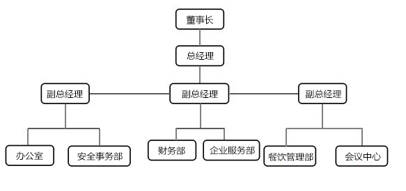 公司内设7个职能部门,分别为:办公室、财务部、企业服务部、工程管理部、安全事务部、餐饮管理部、会议中心。
